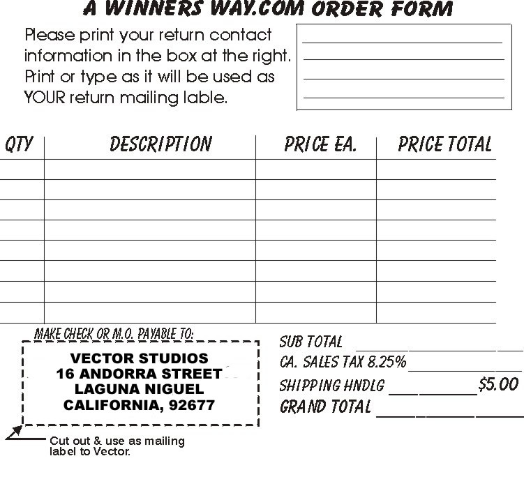 ADD 9.2 % for California orders, and make check or M.O. payable to: VECTOR STUDIOS - 16 ANDORRA ST. LAGUNA NIGUEL, CA. 92677