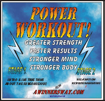 That's what all out products are about here at AWINNERSWAY.COM. Your inner or SUB-conscious mind is the seat of all your outward behavior according to learned psychologists and therapists. It is like a heat-seeking missile when programmed to accomplish a task. However, psychologists say that before a baby is 5 years old it has received more that 100,000 bits of NEGITIVE programming. So how do you change your programming? Programming it, or in this case RE-programming it to truly believe you can do more, lift more, do more reps, run faster, jump higher, and just plain out do your best performance, this is what this AUDIO CD does for you. It implants belief changing affirmations like, "The longer I lift the stronger I get...each time I work out I enjoy it more....I love the time I spend lifting, running, becoming stronger and more fit, I enjoy the fun of losing extra pounds, this is my true reality, and many more. Suddenly you have a different attitude about your abilities and the limit of those abilitites. When you truly believe you are stronger, you BECOME stronger, and you go for more.